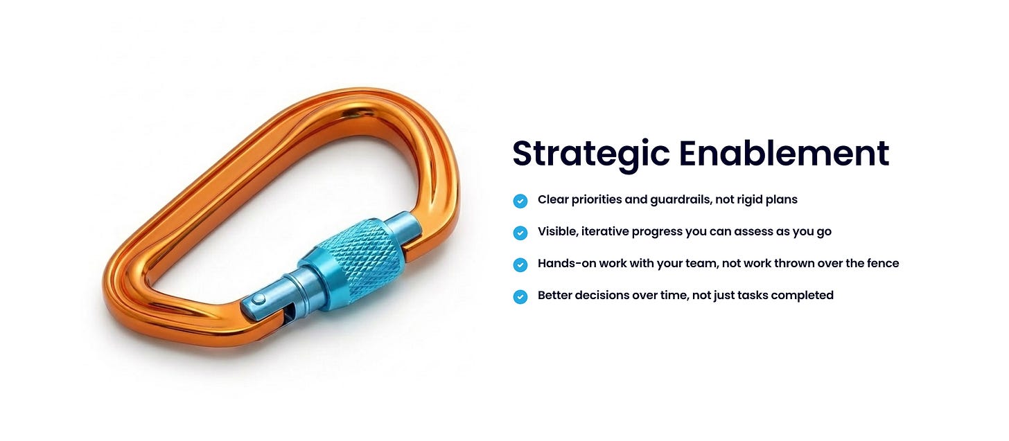 This model also recognizes something that’s been missing for years: the client’s own team is a critical part of the solution. Their involvement builds buy-in and ensures the work doesn’t die when the engagement ends. The goal is not to deliver for them, but to deliver with them—building capability and confidence along the way.